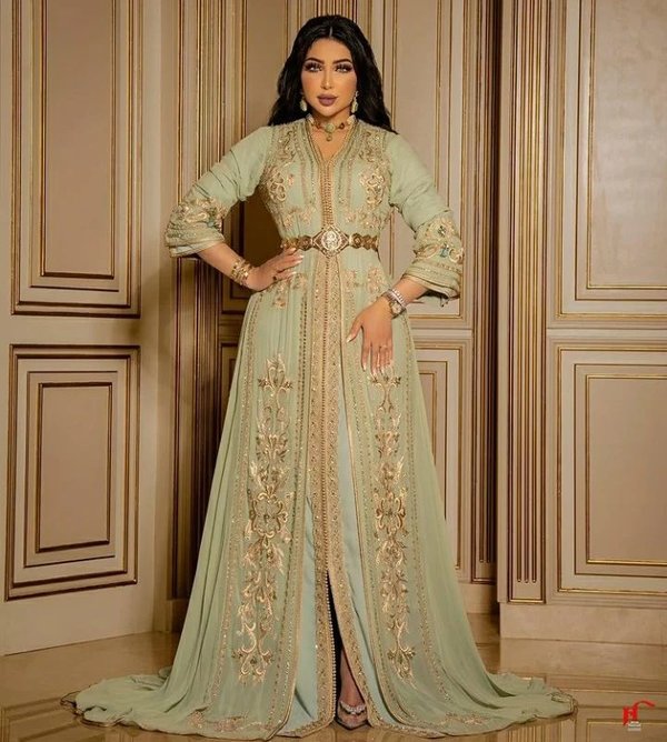 لفتتنا بالجلابية التي اختارتها ذات اللون الأخضر الباستيل مزينة بخرفات ذهبية، وقد زينتها بحزام عند الخصر للوك أكثر عصري.