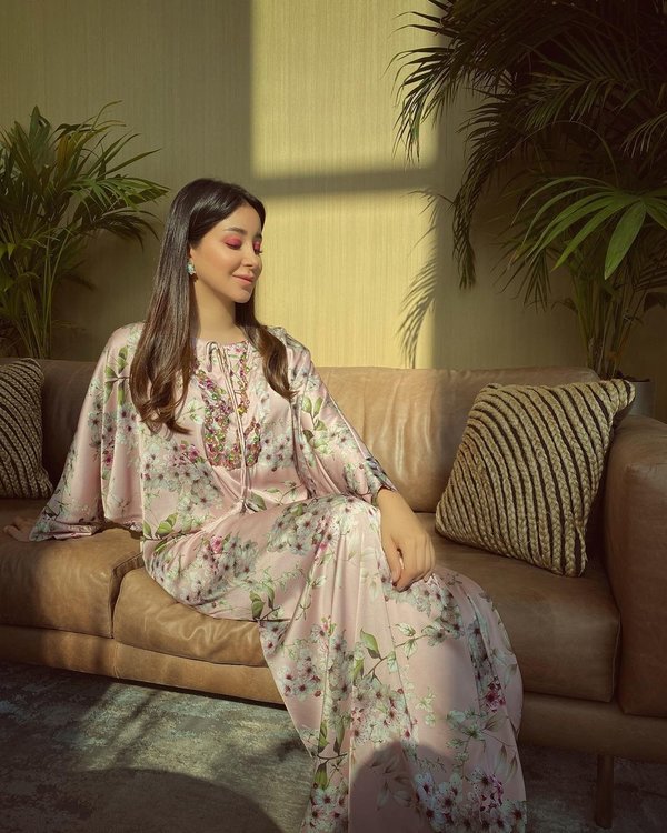 من تصاميم جلابيات رمضان التي لفتت انتباهنا تلك التي اختارتها أسيل عمران. فقد اعتمدت جلابية مطبعة بالأزهار في إطلالة مشرقة للغاية.