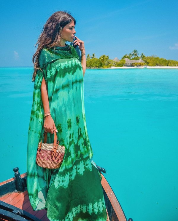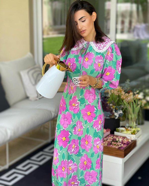 اختارت ريما زهران جلابية ذات ألوان فرحة مطبعة الورود الكبيرة في إطلالة صيفية مميزة جداً.
