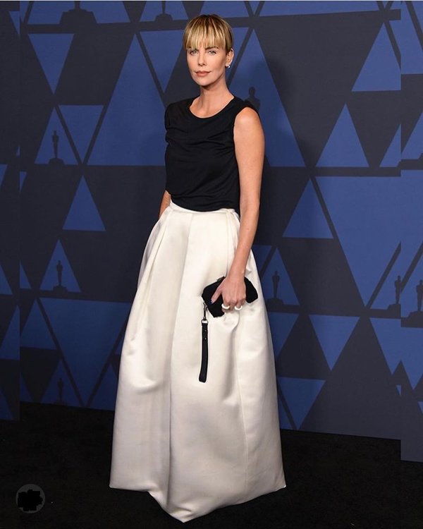 ونتابع جولتنا مع تشارليز ثيرون التي وقع اختيارها على إطلالة المونوكروم فاعتمدت تنورة طويلة بيضاء مع توب سوداء من Tom Ford.