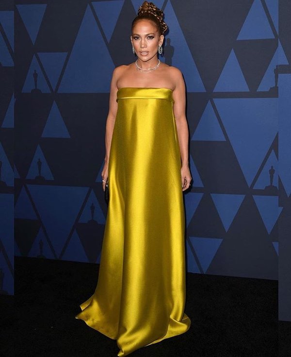 البداية مع جنيفر لوبيز التي أطلت بفستان من الساتان الأصفر حمل توقيع المصممة ريم عكرا وقد تميّز بقصته المشكوفة عند الكتفين والمنسدلة أي المستقيمة. هي إطلالة كلاسيكية وتعكس اناقة واضحة من ل سيما أنها أكملتها بحقيبة يد صغيرة من Tyler Ellis ومجوهرات فاخرة من Harry Winston.