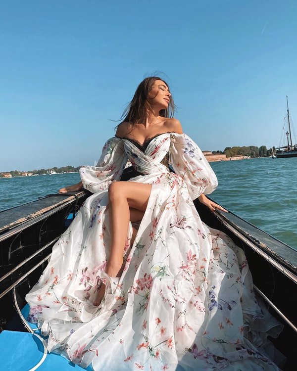 وفي إطلالة ثانية، اختارت سيتفاني فستاناً أبيض اللون مبطع بالنقشات تميز بأكمامة المنفوخة من علامة Adenfashion.