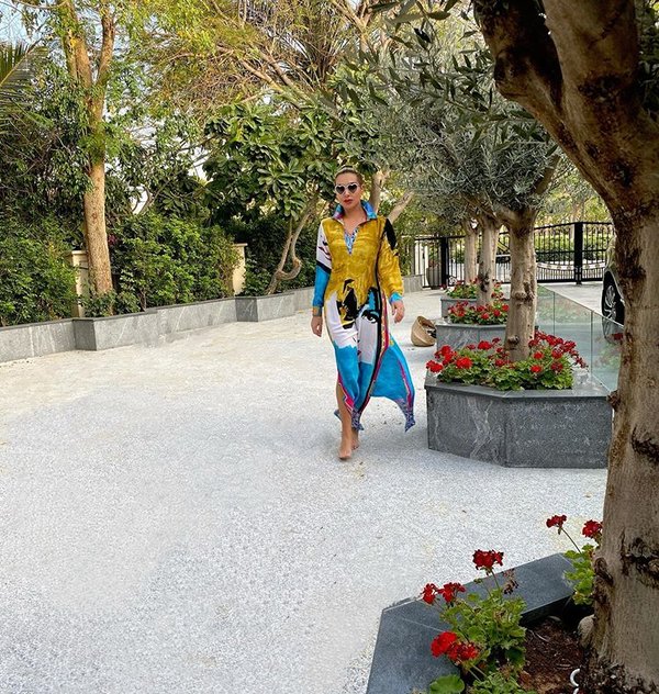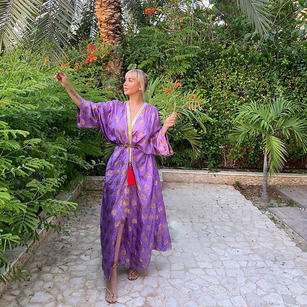 أطلت جويل مرتدية عباءة تميزت باللون البنفسجي ومطبعة، ذات التصميم الواسع والأكمام الفضفاضة، نسقتها مع صندال مفتوح باللون الذهبي واختارت حزاماً للخصر باللون نفسه.