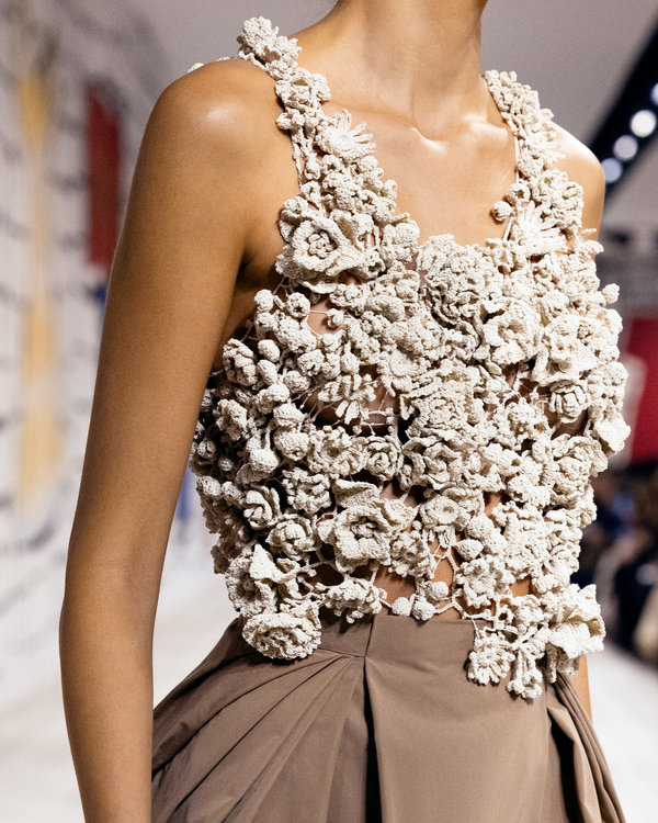 في حين أن الكورسيه الذي لفت انتباهنا وأحببناه جداً من مجموعة Dior للهوت كوتور هو كورسيه الكروشيه المحاك من الورود النافرة والذي نسقته ماريا غراتسيا كيوري مع تنورة باللون البيج.