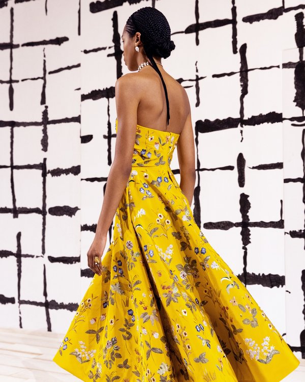 أما الفستان الأصفر الذي يغرد خارج سرب لوحة الألوان يزدان بزخارف الأزهار والنباتات الملونة.
