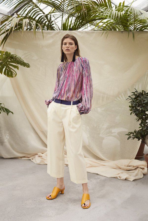 أما البلوزات فتتميز بأكمام كبيرة الحجم والتي نسقتها مع سراويل بقصة مستقيمة، فتمنح من تختارها إطلالة عصرية ومريحة.