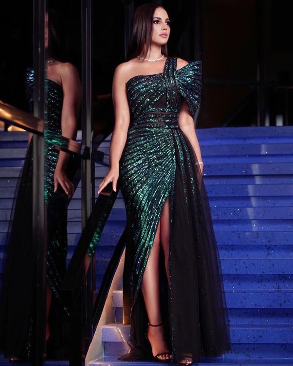 خلال تسلمها جائزة أيقونة الموضة والأناقة العربية في مهرجان ضيافة في دبي، اعتمدت درة زروق فستاناً طويل تميز بلونه الأخضر المزين بالترتر ذات الكتف الواحد. حمل الفستان توقيع المصمم أنطوان القارح.