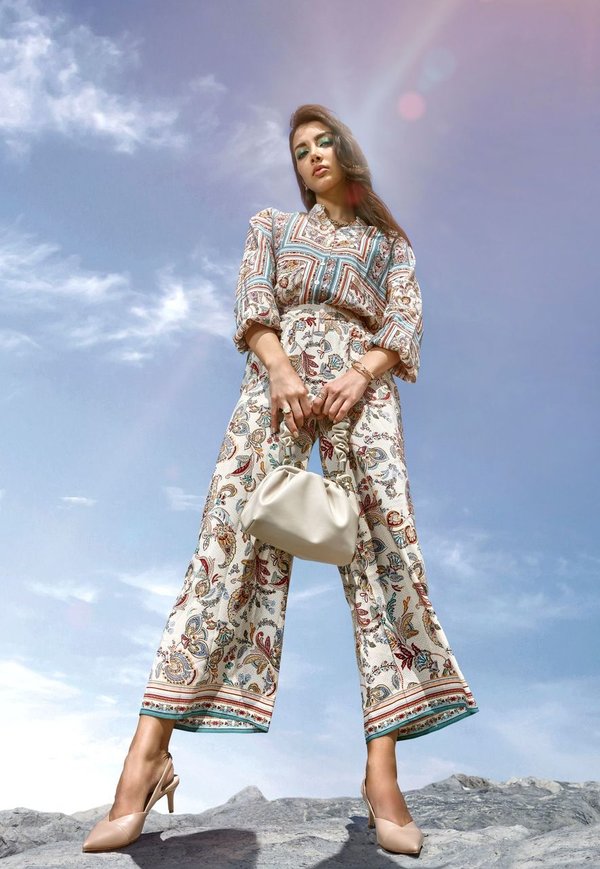ولستايل أكثر حيوي لا تتردّدي تنسيق السروال بالقصة الواسعة مع قميص مطبّع لإطلالة مونوكرومية.