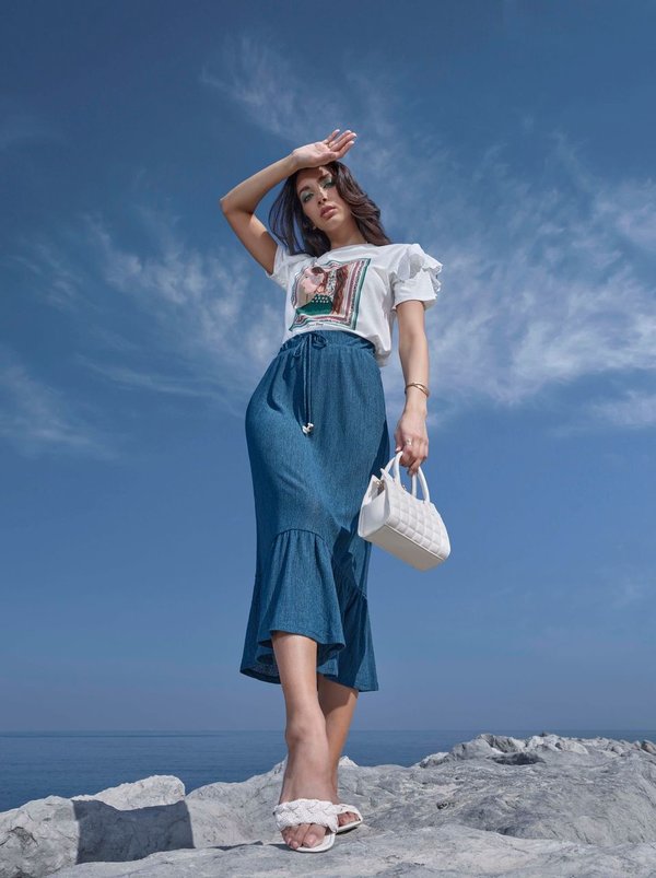 لإطلالة كلاسيكية في العيد، تألقي بتنورة متوسطة الطول مع T-Shirt بيضاء مطبعة لإطلالة مريحة وأنيقة. ولا تنسي أن تزيني إطلالتك بلمسة حيوية مع حزام الخصر!