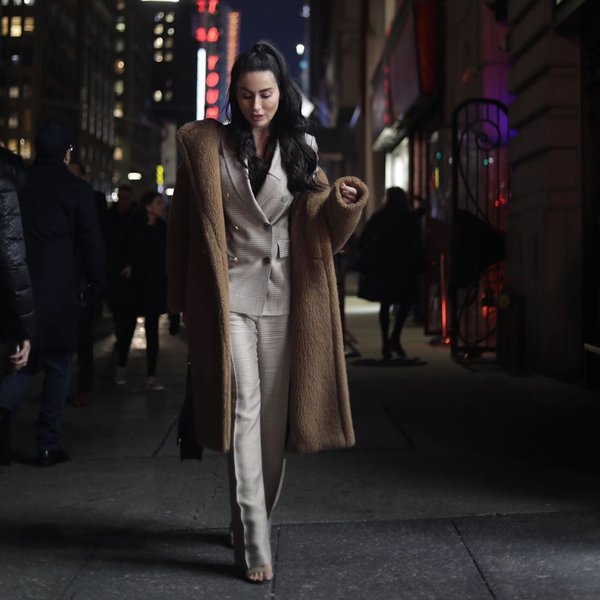 اعتمدت البدلة الرسمية ذات المربعات الصغيرة ونسقتها مع معطف الدب Teddy Coat في أسلوب عملي مميز جداً.