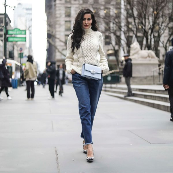 اختارت ديالا إطلالة تجمع بين العملية والكلاسيكية، فنسقت سروالاً من الدنيم مع كنزة من الصوف ذات ياقة عالية وحذاء بالكعب العالي.