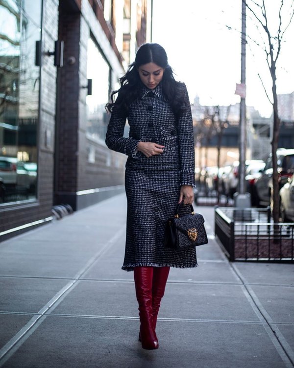 لاحظنا خلال جولتنا على منصات الأزياء أن التنورة متوسطة الطول تفرض نفسها بقوة للموسم المقبل، وقد أطلّت ديالا بتنورة متوسطة الطول مصنوعة من التويد نسقتها مع جاكيت من النقشة ذاتها وحذاء عالي الساق.