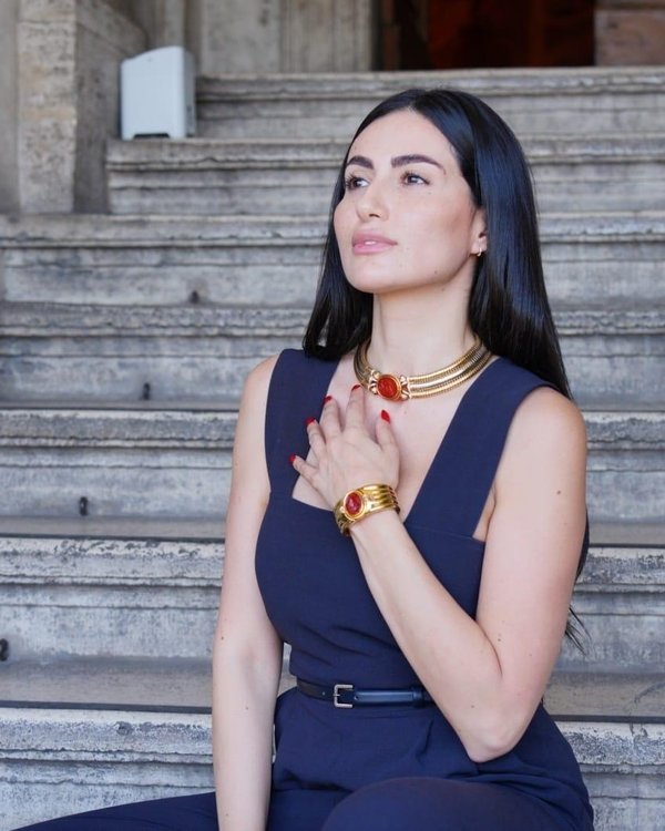 وكما عودتنا، اختارت الإعلامية إطلالتين مختلفتين تتلاءم مع أجواء المناسبة، فإطلالتها الأولى كانت نهارية بامتياز فتألقت بجامبسوت من ماكس مارا Maxmara . وأكملت إطلالتها بعقد شوكر Tubogaz الأيقوني من علامة بولغري وهو مزيج من الأحجار الكريمة: الماس، السفير، الزمرد والروبي يعود تاريخ صنعه إلى العام 1980.
