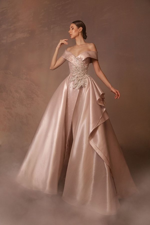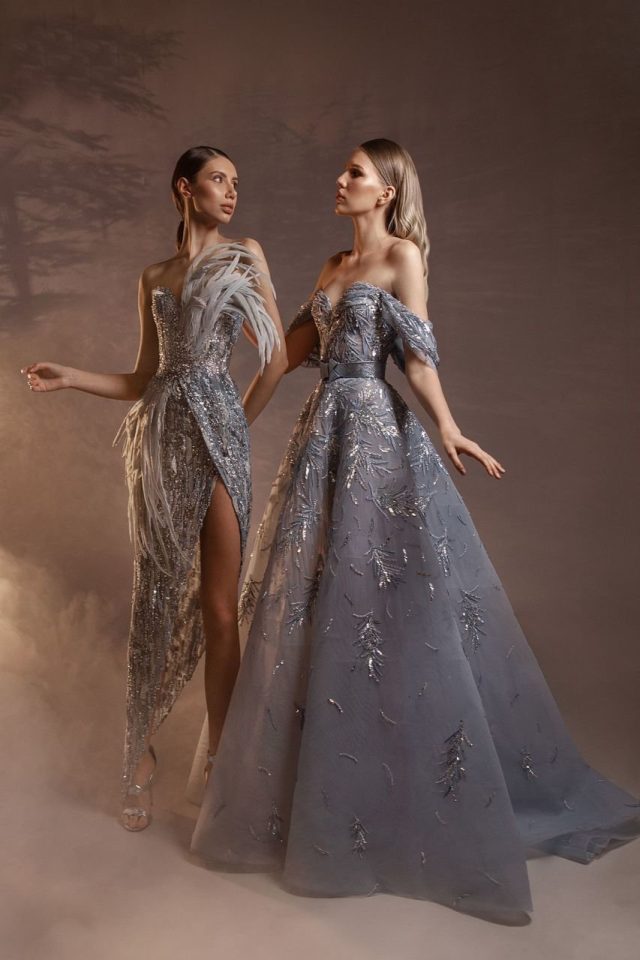 الفساتين تنوعت تصاميمها وقصاتها ما بين الطويلة وتلك المناسبة للحفلات الراقصة ذات التصميم الواسع من الأسفل، أما الفساتين الضيقة فتعانق المرأة في إطلالة ملوكية. فكل الفساتين تنطق جمالاً وسحراً خاصة مع القصات المحددة التي تبرز الخصر من خلال أحزمة مشغولة بأناقة مطلقة.