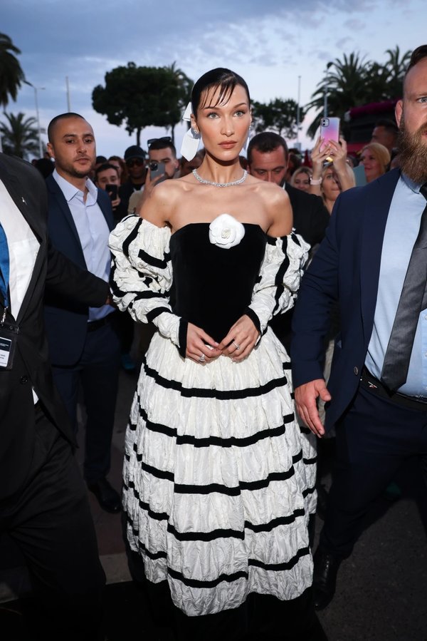 ككلّ عام، استطاعت بيلا حديد أن تخطف الأنظار وأثبتت أنها بالفعل ملكة النجمات على سجادة كان الحمراء دائماً فبعد تألّقها بفستان من أرشيف فيرساتشي يعود إلى عام 1987، أطلّت ليل أمس بفستان Vintage ولكن هذه المرّة اختارته من توقيع علامة Chanel وقد تميّز بلونين الأبيض والأسود والمفارقة هنا أنّ هذين اللونين سيطرا بشكلٍ واضح على سجادة كان الحمراء لعام 2022. عكس هذا الفستان قصّة الأكمام المنفوخة وقد أتت منسدلة على الأكتاف وقد عكس بدورة زهرة الكاميليا التي تعتبر من رموز علامة شانيل.