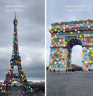 - استخدمت علامة Louis Vuitton الواقع المعزّز Augmented Reality، على معالم سياحيّة بارزة، مثل Tour Eiffel وArc de Triomphe، لتغطيتها بتوقيع Yayoi Kusama من النّقاط.