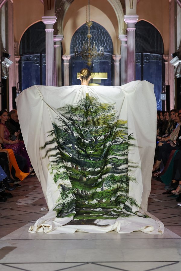 كتحية لبيروت، تضمنت التشكيلة فستاناً أبيض شفاف مزين بأرزتان مطليتين باللون الذهبي ومرصع بـ"شواروفسكي"، و"كاب" يبلغ طوله 4 أمتار رُسمت عليه أرزة كبيرة يدوياً، وذلك في تعاون بين "دار عمران عثمان" والرسامة نجلا حبيش.