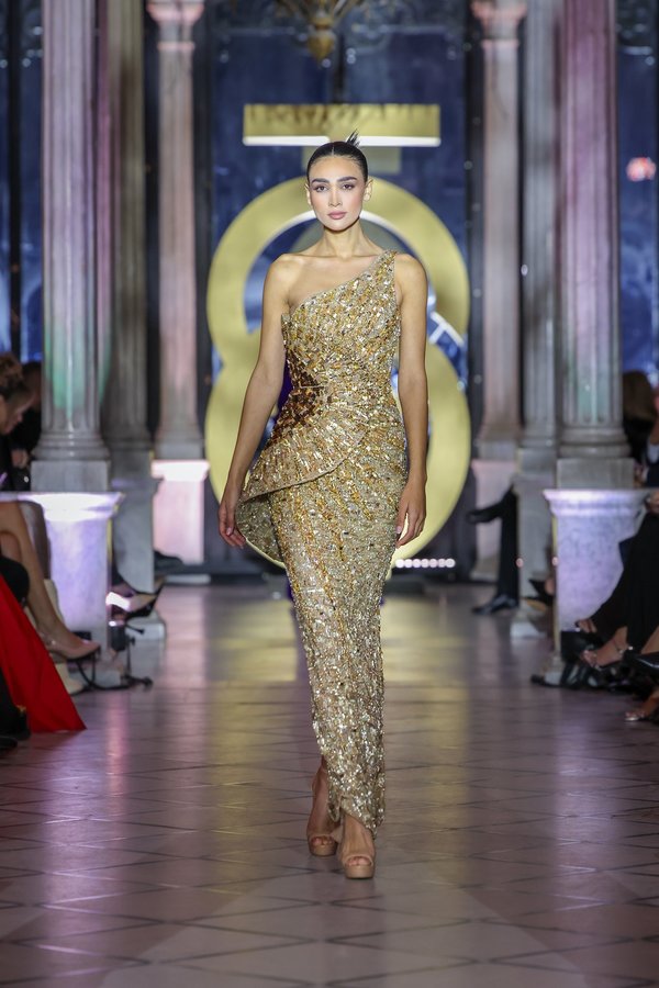لتتولى بعدها العارضات على المنصة لعرض المجموعة التي تضمنت 25 فستاناً مزينة بورود مرصّعة بأحجار الألماس، وبلغ عددها في المجموعة 83 حجر من الألماس بعيار 1.5 قيراط. فيما برزت 6 فساتين مطرزة بالكامل بتقنية "الكافيار" وهي تقنية تُنفّذ بالخيط.