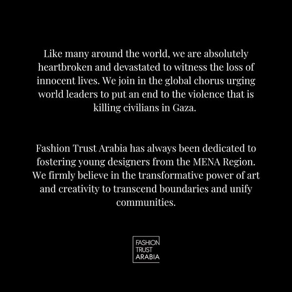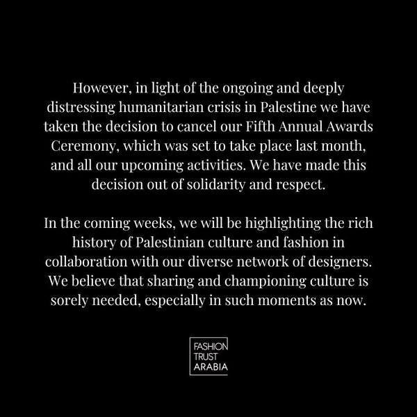 بحزنٍ كبير، لن نستمتع هذا العام بحفل فاشن تراست ارابيا الذي ألغى منظموه هذه الفعالية بسبب الأوضاع التي تجرى في فلسطين حيث تم نشر على الصفحة الرسمية على انستغرام الخبر التالي وذلك من منطلق التضامن والاحترام.