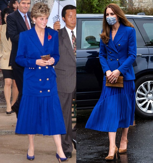 قامت كيت بتقليد حماتها الراحلة تقريبًا تمامًا مع سترة مربعة من الكوبالت وتنورة متوسطة الطول مطوية من Zara وHope على التوالي من خلال إقرانها بحقيبة يد بنية من Metier لظهورها في اسكتلندا في 24 مايو 2021. الفرق الوحيد الملحوظ في مظهرهما هو أن الأميرة ديانا ارتدت نسختها من الزي عام 1992 بأحذية زرقاء بدلاً من جلد الغزال الجملي.