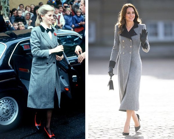 ارتدت كيت المظهر الذي ارتدته حماتها الراحلة في عام 1984 في اليوم الثاني من خطوبتها في رحلة منفردة إلى الدنمارك في 23 فبراير 2022. يحتوي المعطف المصنوع من الكشمير والصوف باللون الرمادي المعدني على أساور وطيات صدر سوداء، وقد صممه واحدة من ملابس كيت المفضلة: كاثرين ووكر. ولإكمال المظهر، أضافت قفازات سوداء وحقيبة سوداء وحذاءً أسود.
