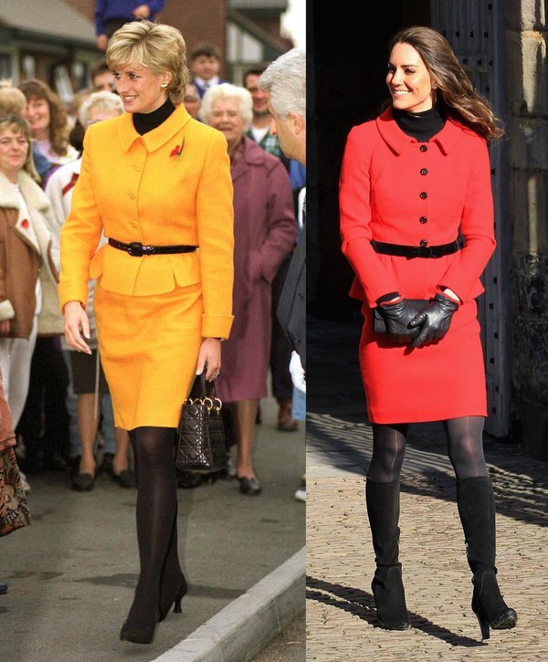 أميرة ويلز الراحلة ترتدي حلة برتقالية مع حزام أسود أثناء زيارتها لليفربول عام 1995، ودوقة كامبريدج آنذاك ترتدي حلة حمراء مع حزام أسود عام 2001.