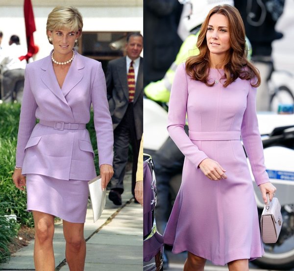 الأميرة ديانا ترتدي بدلة تنورة خزامية أثناء زيارتها لواشنطن العاصمة في عام 1997 وكيت ترتدي الخزامى إميليا ويكستيد أثناء حضورها القمة الوزارية العالمية للصحة العقلية في 9 أكتوبر 2018.
