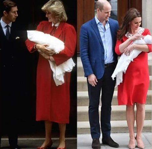 اختارت كيت ميدلتون في الإطلالة الأولى بعد ولادة طفلها الأمير لويس عام 2018، ارتداء معطف أحمر بياقة بيضاء، وهي نفس الإطلالة التي اختارتها الأميرة ديانا في عام 1984 بعد ولادة الأمير هاري.