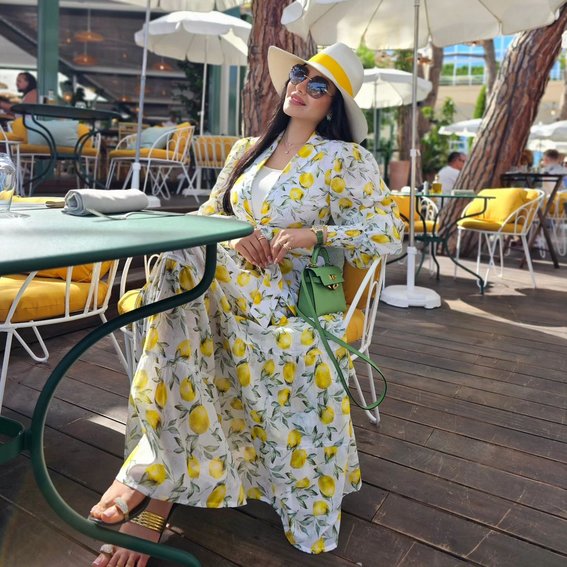 فستان لجين عمران كزين بطبعات طيفية منعشة وهي حبات الليمون الصفراء، حيث تعتبر هذه الطبعات الأكثر رواجاً هذا الموسم.