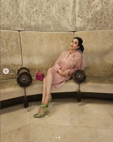 فستان باللون الزهري البراق المزين بالريش من تنسق لجين عمران، وهو من أجدد فساتين لجين عمران وأكثرها أناقة.