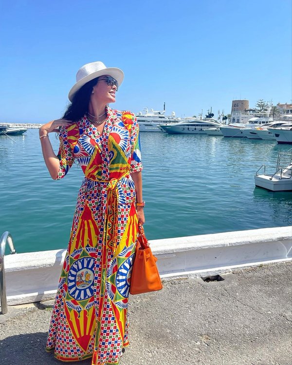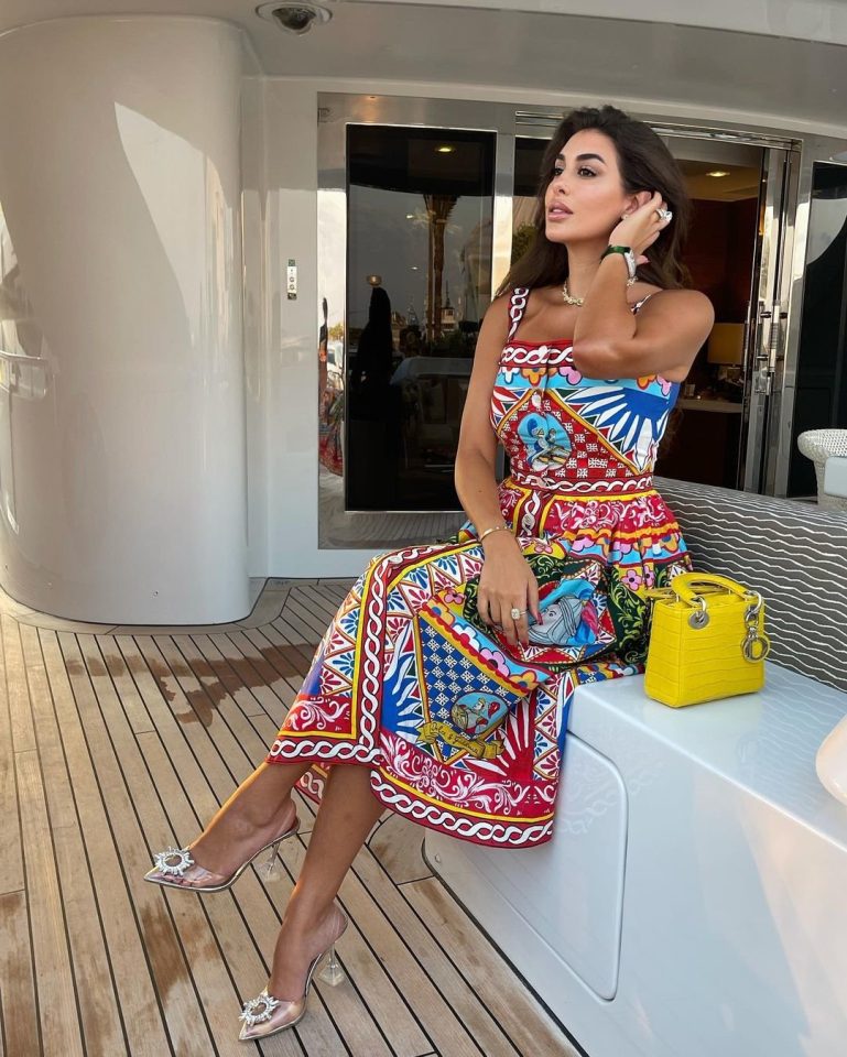 أما فستان ياسمين صبري الذي ننصحك باعتماده خلال سفرك فهو فستان ميدي يتميز بقماشه المنقوش ذات الألوان الحيوية. وهو مناسب جداً لعشاء رومانسي مع شريكك!