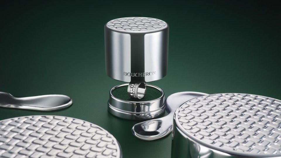 والسبب في اختيار هاتين المادتين يعود أولاً إلى أن الألمنيوم يعدّ خياراً غير عادي في هذا القطاع. حيث يستخدم المعدن بشكل أكثر شيوعاً في صناعة الطيران والأغراض والأمتعة الفاخرة، ومن المعروف أن هذا المعدن خفيف الوزن وقويّ وجذّاب من الناحية الجمالية. ولتلبية متطلّبات التنمية المستدامة، اختارت بوشرون صوفاً معتمداً بمعيار الصوف المستمدّ بمعايير المسؤولية المهنية (RWS). إلا أن الدار تجاوزت المواد بحدّ ذاتها لتعيد النظر بجرأة في تقديم المجوهرات نفسها والمتأصلة بعمق في أعراف وثقافة تقدّم العريس بطلب الزواج. فمن خلال التخلّي عن الغطاء المفصلي التقليدي الذي عفا عليه الزمن اليوم من حيث تطلّبه استخدام قطع عدّة غير القابلة لإعادة التدوير، أعادت الدار تحديث نظام فتح العلبة لتجعله أكثر بساطة.