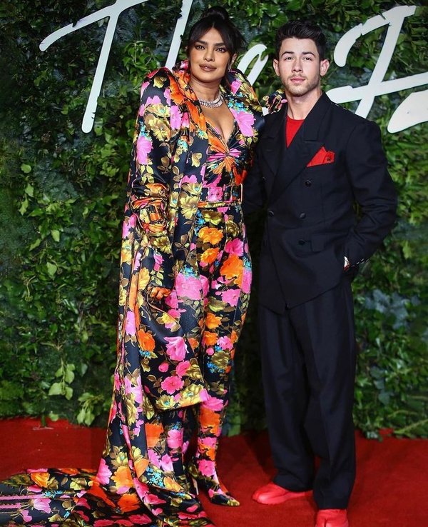 بريانكا شوبرا أطلت على السجادة الحمراء في حفل جوائز British Fashion Awards 2021 إلى جانب زوجها، في أول إطلالة لهما بعد انتشار أخبار طلاقهما. وقد اختارت لوكاً مطبعاً بالأزهار من Richard Quinn.