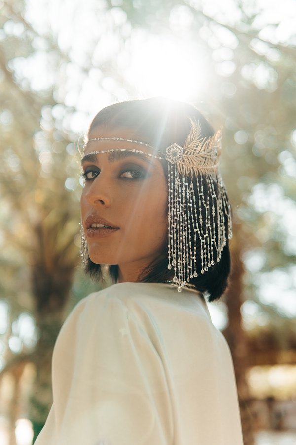 تتميز قطعة حليّ الرأس بالألماسات المرصعة عليها على شكل جدول نهري بتصميم مستوحى من النسيج التقليدي لأوراق النخيل المجففة، بينما تأتي الزخارف التي تأخذ شكل جريد النخيل حول التاج كرمز للاحترام والفخر لهذا الشعار الثقافي.