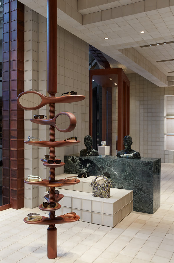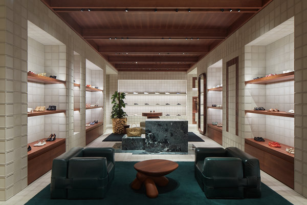 لمحاكاة خامات Bottega Veneta الاستثنائية تم تزيين المتجر بمقاعد جلدية منسوجة باللون الأخضر والبني والأسود على اختلاف درجاته، لتحاكي تصاميم العلامة الأيقونية، مثل مقبض الباب الرئيسي للمتجر الذي يستعيد حقيبة ساردين وأواني النباتات الخزفية التي صنعها استوديو ميلان الذي يصنع العديد من تفاصيل بوتيغا فينيتا الخزفية والمطلية بالمينا.