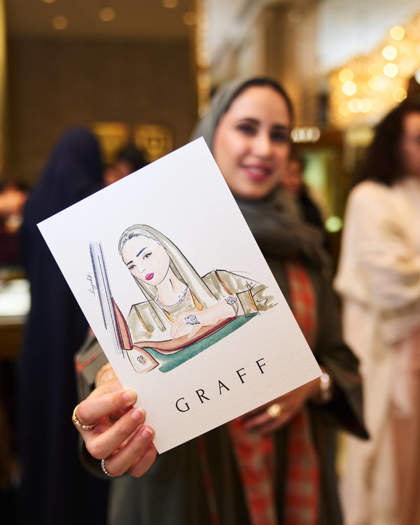 في سياق هذا الحدث، انضمت الرسامة السعودية والكاليغرافية Anjali Rengan إلى الحاضرات اللواتي استمتعن بمشاهدة Anjali وهي تعكس الحملة الإعلانية الجديدة الخاصة بمجوهرات مجموعة Graff Butterfly على الورق.