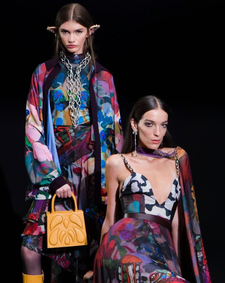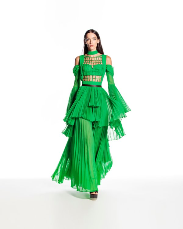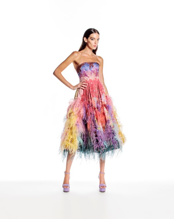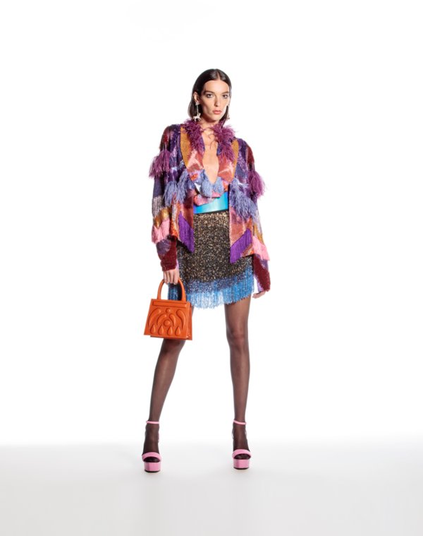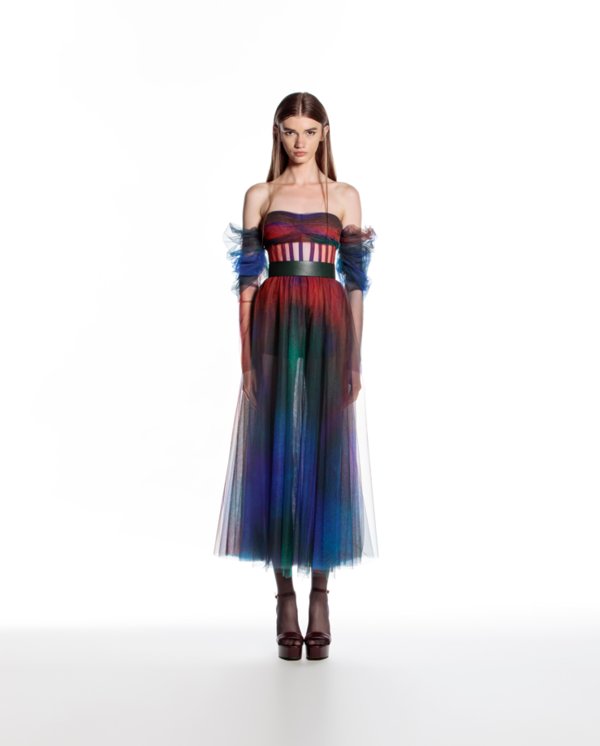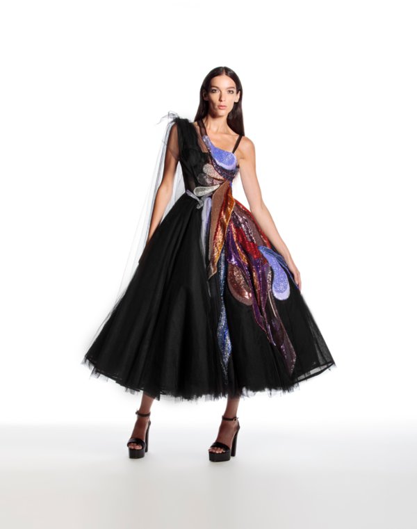 تأتي التصاميم بمجموعة متنوعة من الأقمشة، من الشيفون الانسيابي، التويد والتول، وصولاً إلى الجلد، الدنيم والقماش المخرم، ترافقها أكسسوارات مختلفة وحقائب جديدة بعشر إصدارات مختلفة.