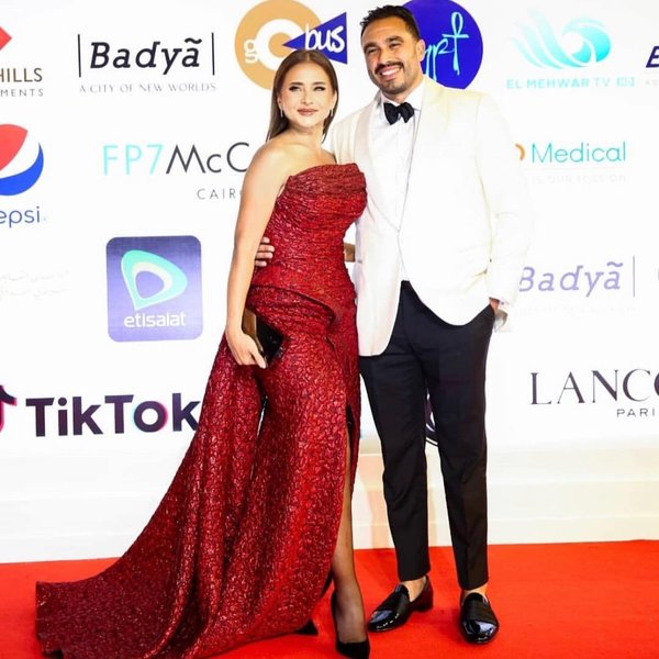 نيللي كريم أطلت على السجادة الحمراء برفقة زوجها واختارت فستاناً باللون الأحمر العنابي من Maison Yeya.