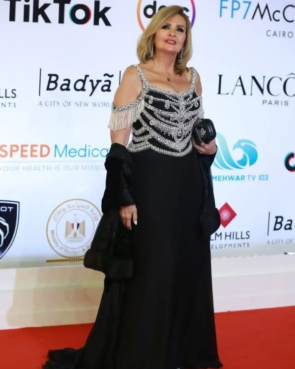 يسرا اختارت فستاناً أسود اللون من رامي قاضي مزين بأحجار فضية من فوق.