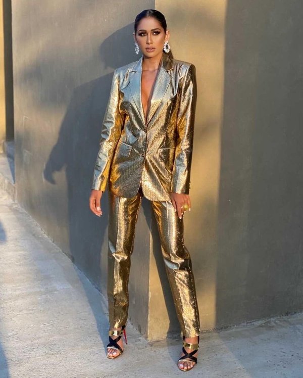 لفتتنا مقدّمة البرامج أنجي كيوان بإطلالتها المميزة جداً، فقد اعتمدت بدلة تميزت بلونها الذهبي من تصميم متجر 1422 Official، وهو أول Concept Store لأزياء الهوت كوتور في العالم. نسقتها مع صندال باللون الأسود والذهبي في إطلالة بغاية الشياكة.