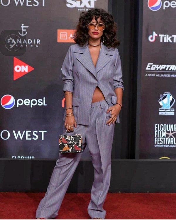 اختارت الممثلة اللبنانية سينتيا خليفة إطلالة فيها الكثير من الجرأة، فاعتمدت بدلة باللون الرمادي مقلمة تميّز سروالها بخصر منخفض وسترة مفتوحة من تصميم Malak El Ezzawy. في لوك عصري جريء!
