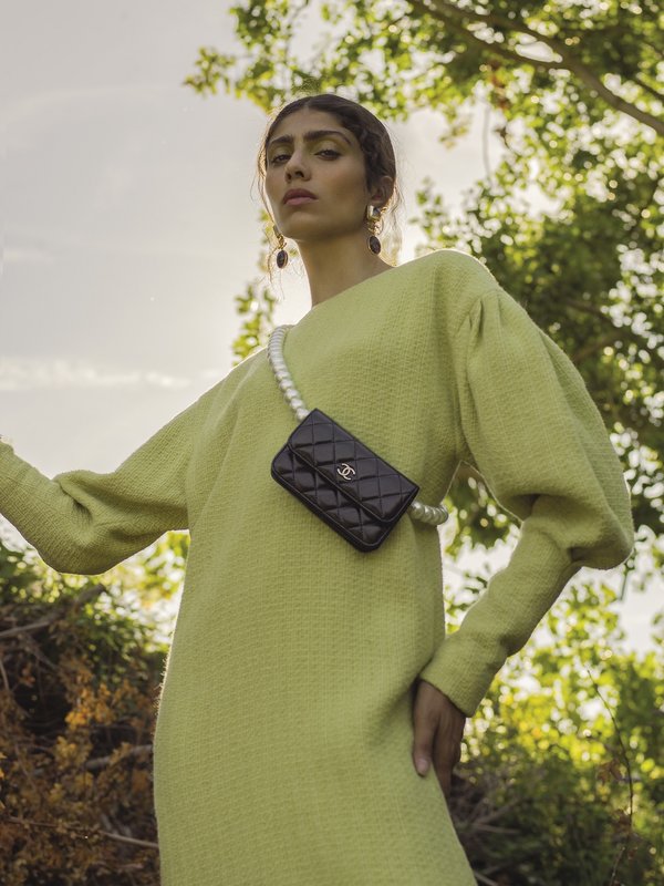 أما إذا كان خيارك الفستان، نقدم لك هذا الفستان الذي يتميز بلونه الأخضر الفاتح بقماش حرير التويد، وقد نسقناه مع حقيبة بالحجم الصغير مزيّنة بالخرز لإطلالة في غاية من الشياكة والعملية في نفس الوقت.