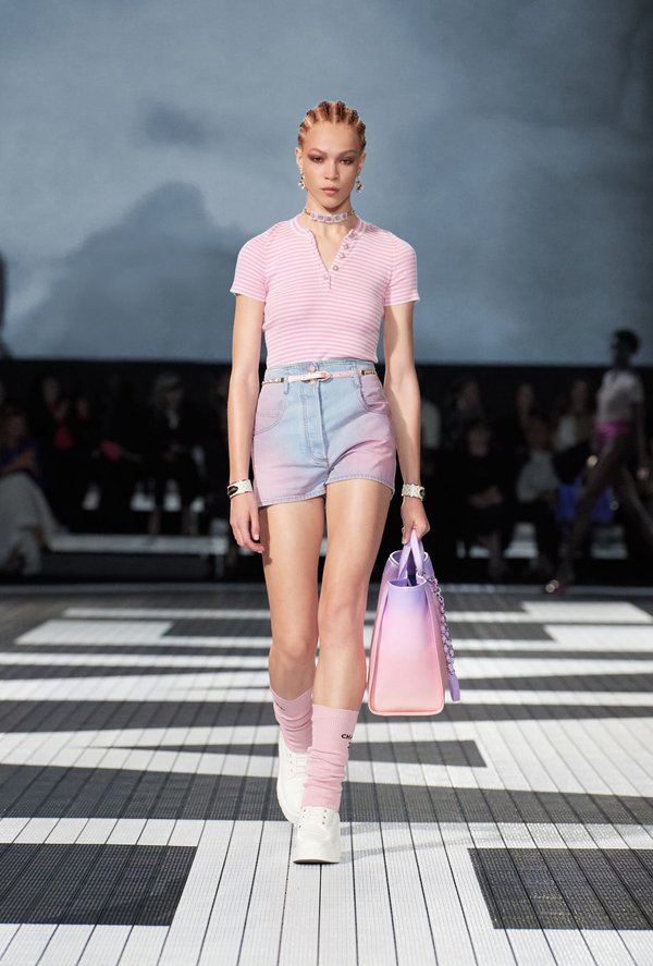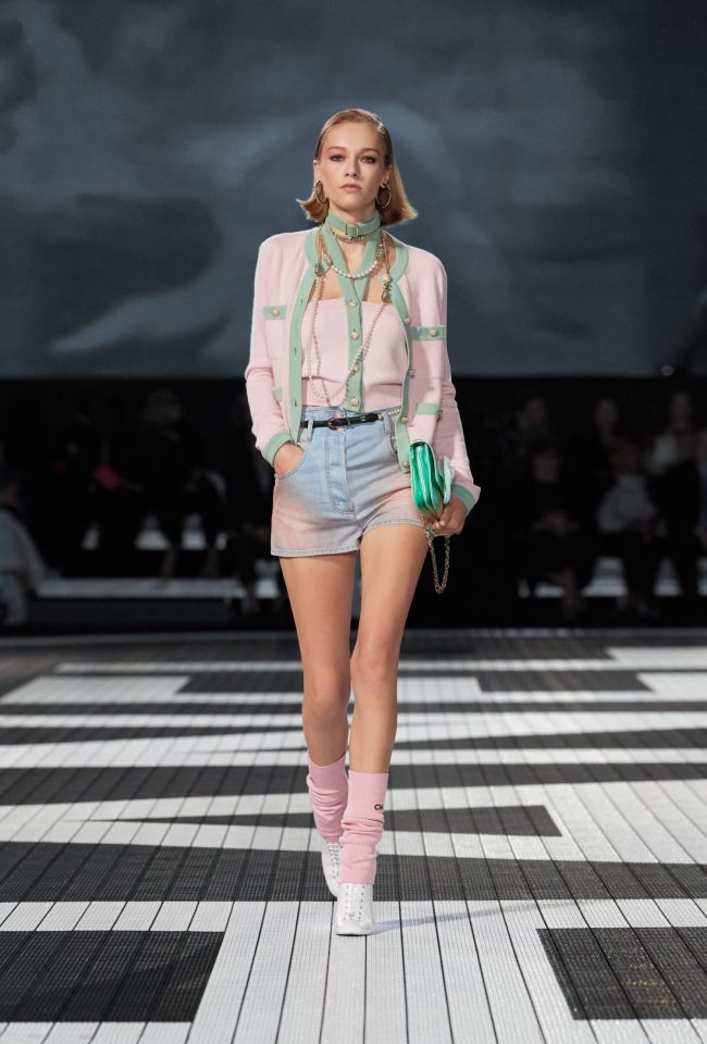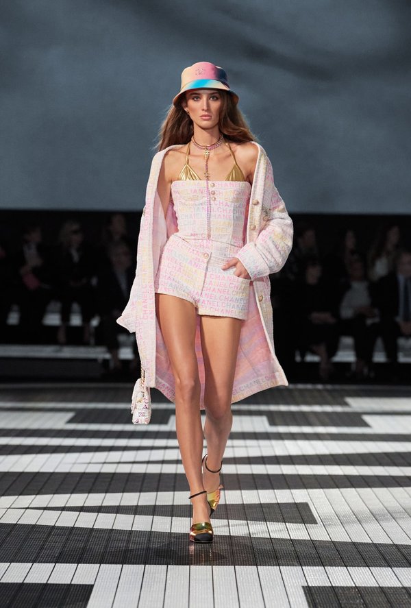 لنتكلم قليلًا أيضًا عن الألوان المتبعة والتي تدرّجت بين الباستيل من الوردي الفاتح، الأزرق الفاتح، العاجي وصولًا إلى الأبيض والأسود وهما رمز العلامة كما تم الإعتماد على التطريزات، الزخارف والعلامات الخاصة بالدار من أشكال المربعات الذهبية، الشفرون بالأسود والذهبي، كرات الديسكو والزلاجات الدوارة بطابع أحبه كارل لاغرفيلد.