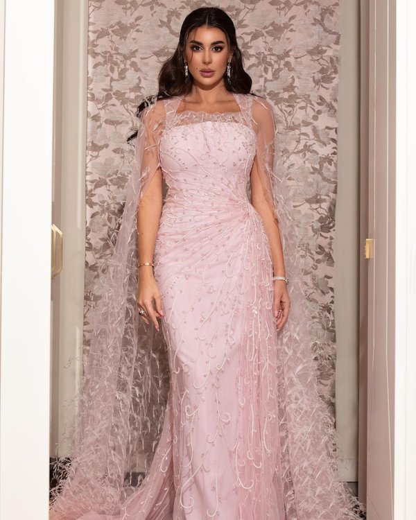 ياسمين صبري أطلت بفستان باللون الزهري من رامي قاضي ذات الأكتاف المنسدلة من قماش الشفاف والمزينة بالريش.