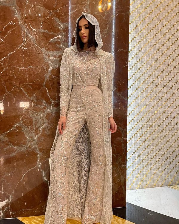 أما في اللوك الثاني اعتمدت جمبسوت مزيّن بالحبيبات البراقة.