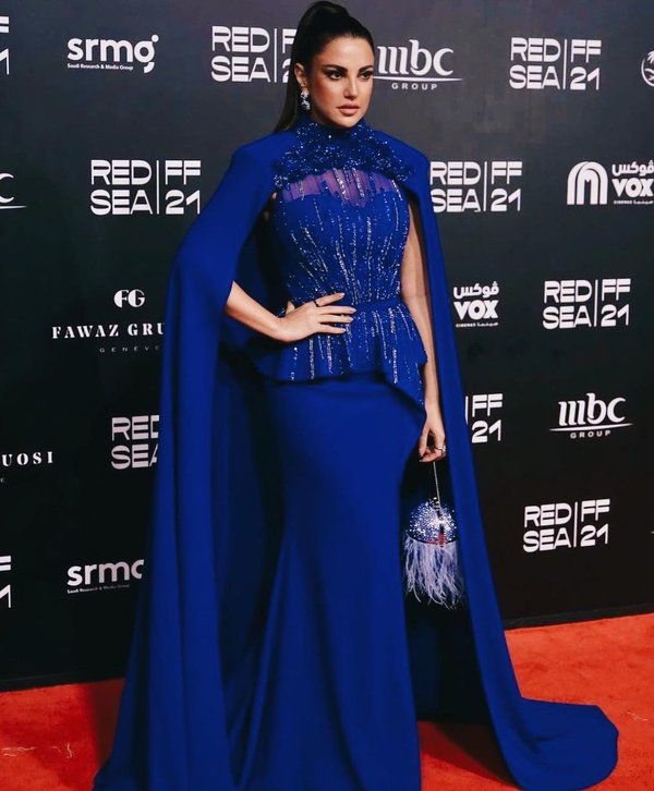 درة زروق اختارت فستاناً باللون الأزرق بأسلوب الكاب من طوني ورد.