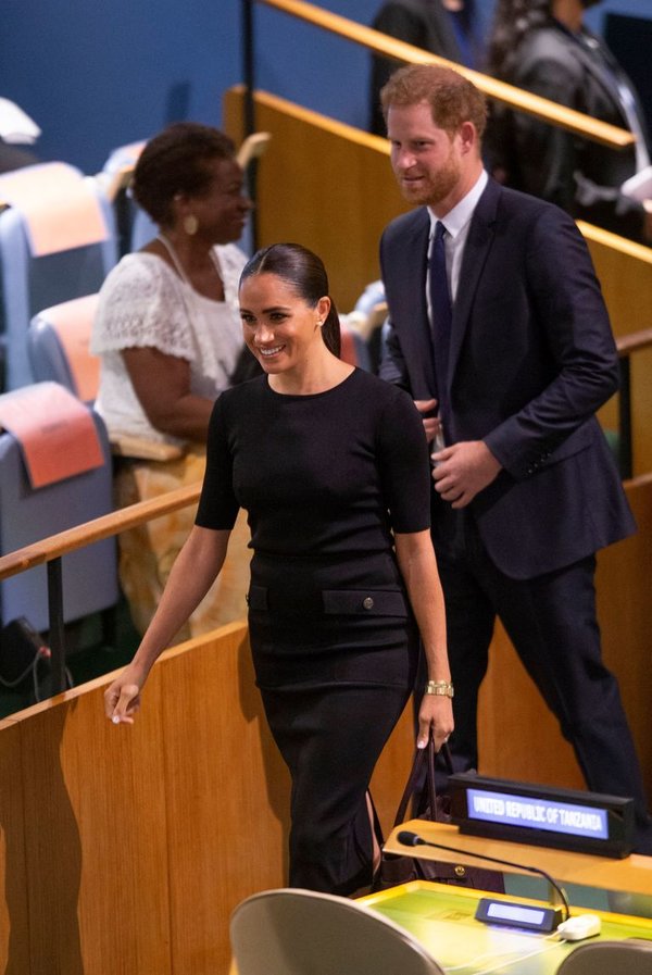فخلال مشاركتها إلى جانب الأمير هاري في احتفالية يوم نيلسون مانديلا في مقر الأمم المتحدة، وخطفت ميغان ماركل الأنظار بإطلالة أنيقة باللون الأسود. في التفاصيل، أطلت ميغان بفستان أسود متوسط الطول ذات أكمام قصيرة من علامة Givenchy.