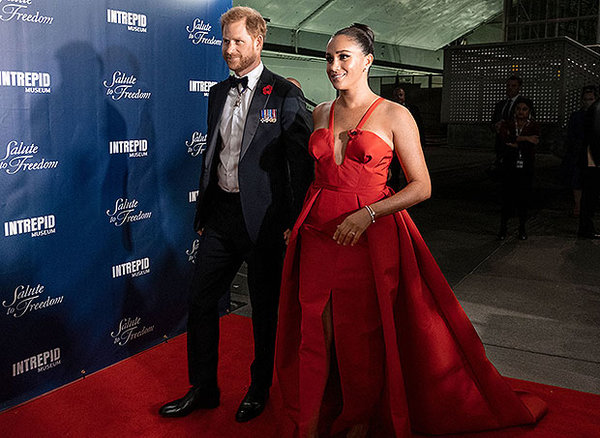 خلال مشاركتها إلى جانب زوجها الأمير هاري في حفل غالا لتكريم المحاربين القدامى Salute to Freedom Gala في متحف Intrepid، اختارت ميغان ماركل فستاناً باللون الأحمر بقماش الساتان من Carolina Herrera، زينته بحزام عند الخصر تدلى على شكل ذيل طويل في إطلالة تضج أنوثة خاصة وأن الفستان تميز بقصة أمامية.