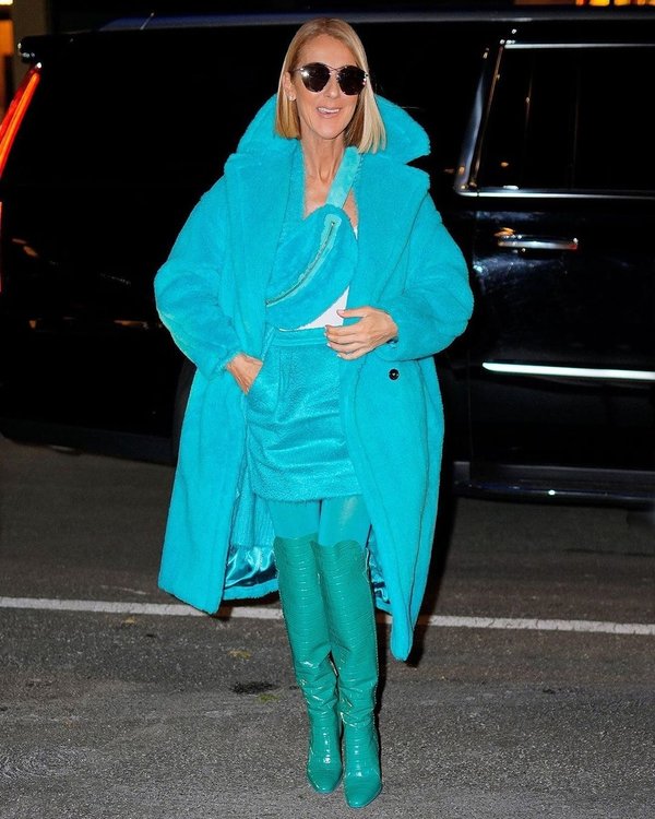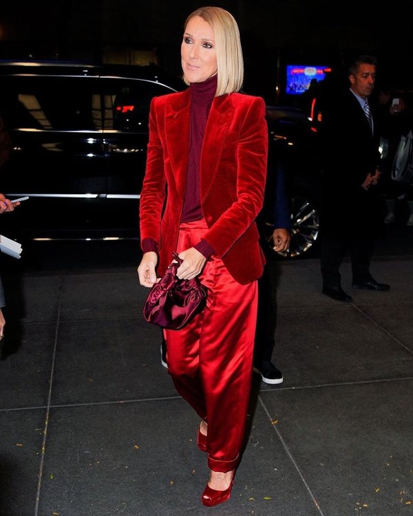 أما النجمة العالمية سيلين ديون، فاعتمدت هذا اللوك مرتين متتاليتين خلال تواجدها في نيويورك للترويج لألبومها الجديدCourage . ففي الإطلالة الأولى، وقع اختيارها على اللون الأحمر في إطلالة مشابهة لجيجي حديد.
