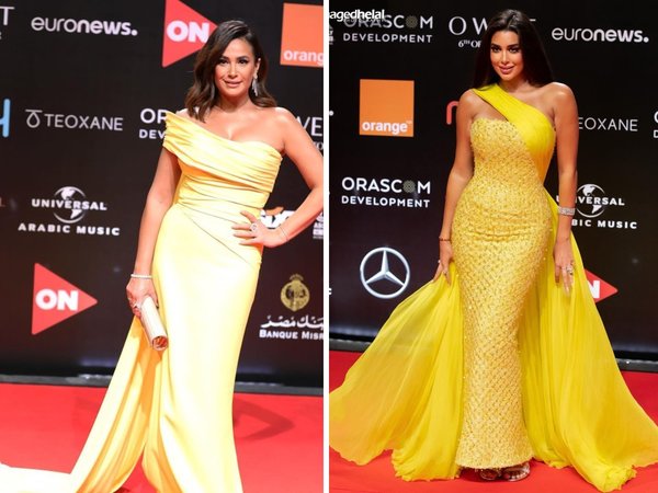هي صدفة كبيرة أن تختار ياسمين صبري فستاناً باللون الأصفر من تصميم رامي قاضي تميز بقصته الضيقة، وفي اليوم نفسه أطلت هند صبري بفستان أصفر من قماش الستان من تصميم فوائد سركيس.